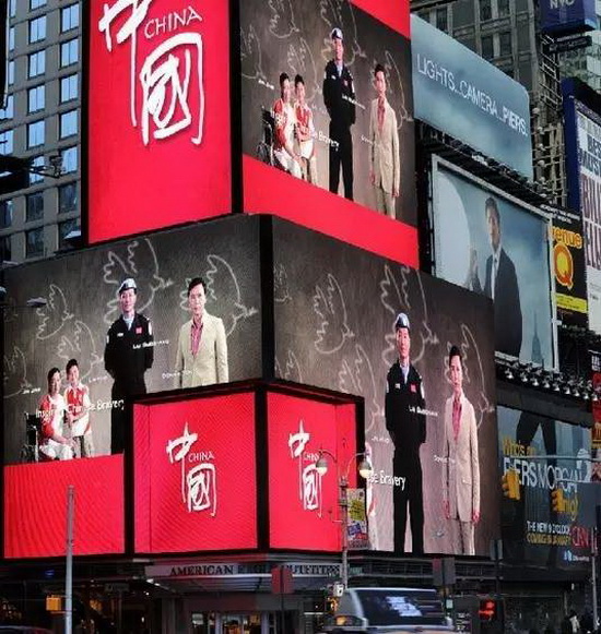 由于时代广场在全世界的知名度及超高的人流量,世界上众多品牌、人物都以登上时代广场为荣,其中包含:新华社、格力、比亚迪等机构和品牌,以及国家形象宣传片、北京、上海、成都、宁波等城市形象宣传片,同时包括丽江、桂林、武当山等知名景点宣传片都在纽约时代广场相继亮相。