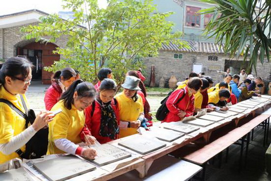 嘉宾们在陶砖盖上手印